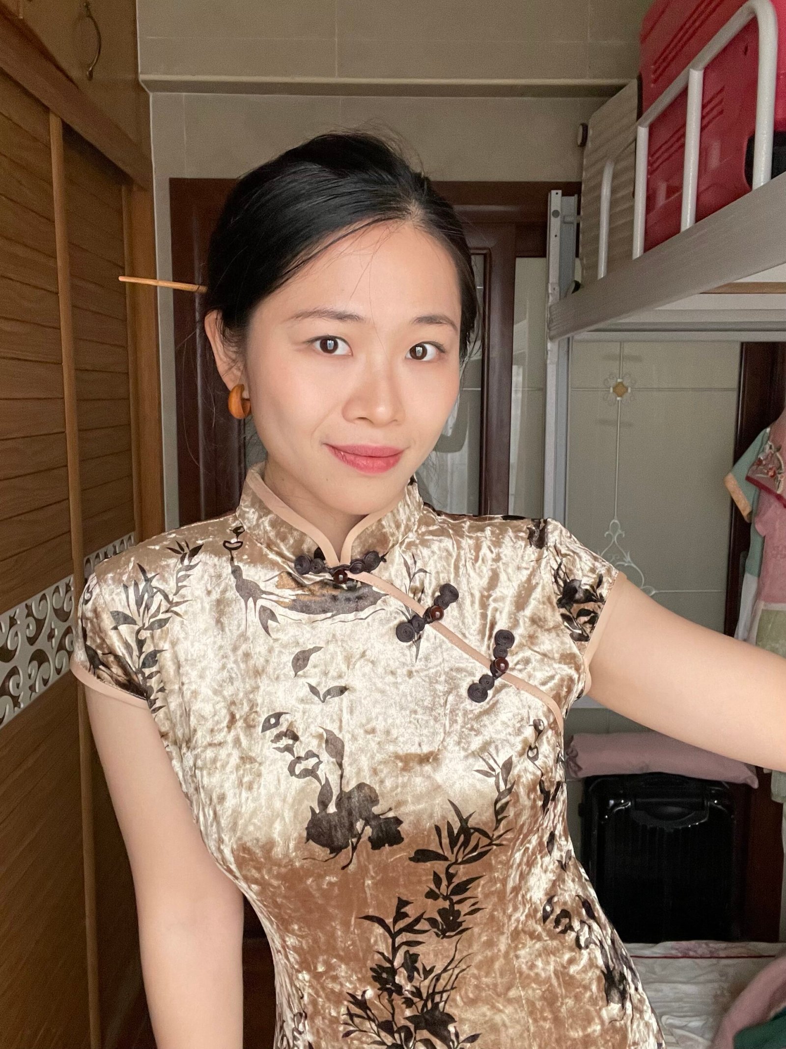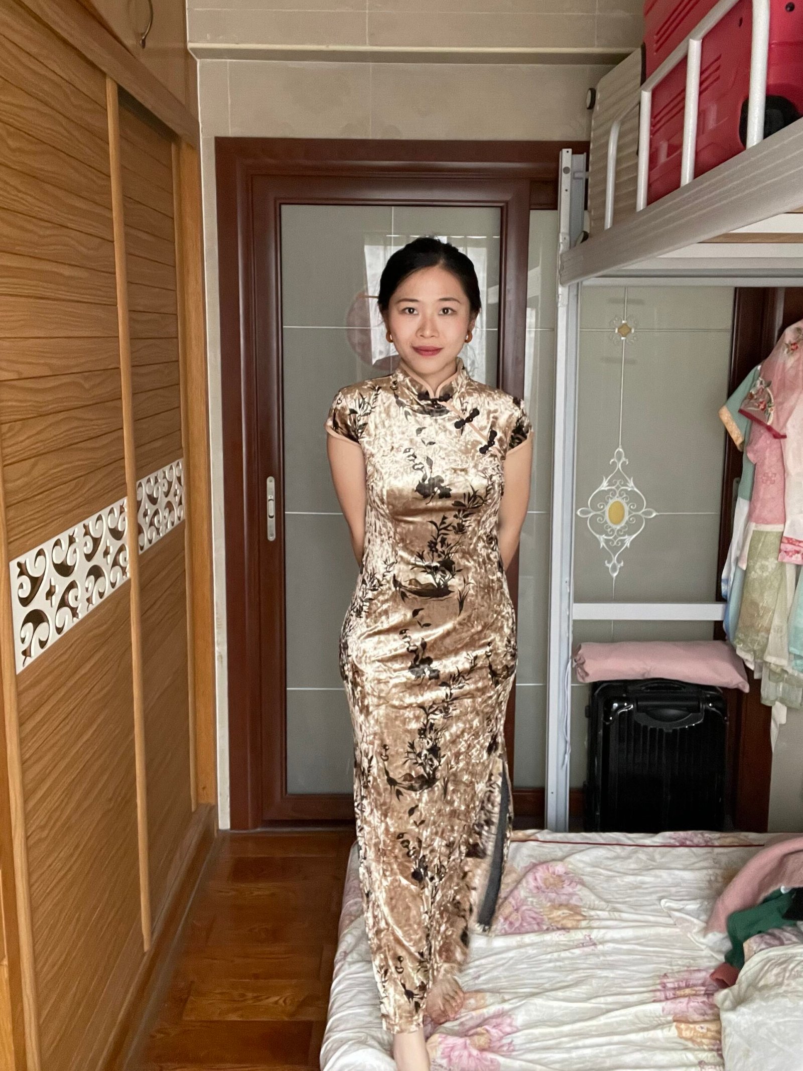 The Champagne Gold Velvet Print Qipao Dress features a refined silhouette with a soft velvet texture and elegant printed details. Designed to flatter the body, it blends timeless Chinese inspiration with modern sophistication.